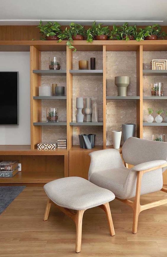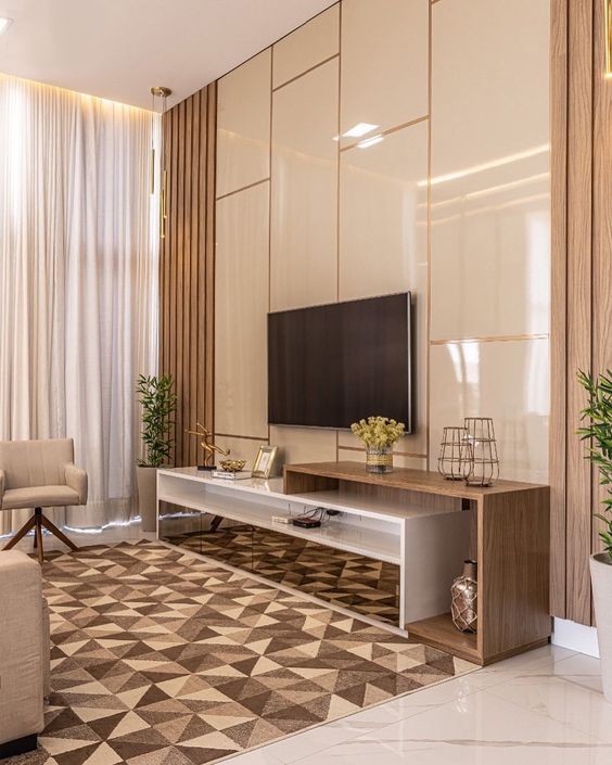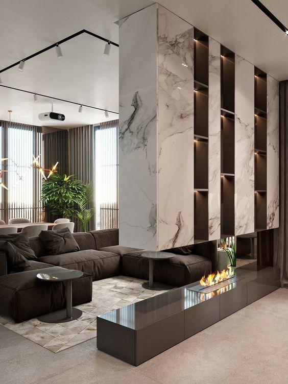 Как правило, в состав этого элемента интерьера входят стеновые панели, консоль, стеллаж, полки, элементы подсветки. Стильно дополнит ТВ-зону кофейный или журнальных столик, выполненный в том же дизайнерском стиле. Модной тенденцией ТВ-зоны становится биокамин.